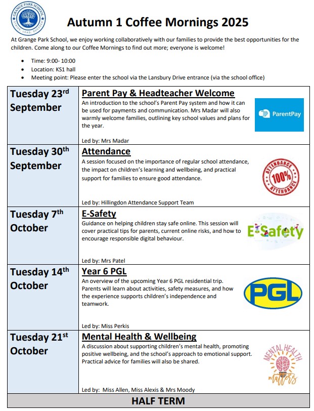 Come along to our weekly Coffee Mornings where you can enjoy a hot tea, coffee and biscuits whilst learning more about what we do in school! Many of our Coffee Mornings are pupil-led so pupils can share, articulate and celebrate their learning. All Grange Park parents and carers are welcome!